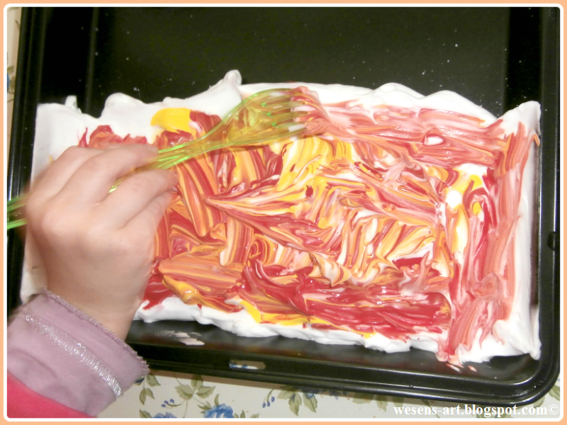 (wie man Stoffe marmoriert) sah, dachte ich, dass es klasse wäre, das mit meiner Enkelin zu machen.